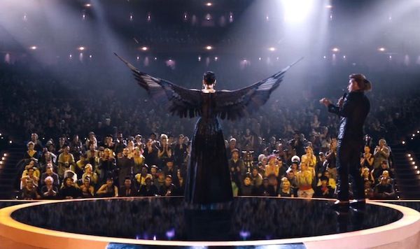 Katniss (Jennifer Lawrence) is placed at the centre of the image, allowing her to visually dominate the frame. As she is placed above the audience it suggests her power over them and perhaps foreshadowing her overthrowing the Capitol in the later films. Additionally, as the camera captures Katniss from behind making her appear as less as an individual and more of a symbol. As the Capitol audience cheers without truly understanding the true meaning of the Mockingjay dress, much like how progressive regimes can fail to see rebellion forming beneath their noses. This moment helps set the stage for the upcoming revolution, as the districts watching on their scenes will recognise the Mockingjay as their sign of hope and defiance. Through effective use of cinematography, lighting, costume design, and framing the film is able to subtly convey Katniss’ transformation from survivor to revolutionary leader.