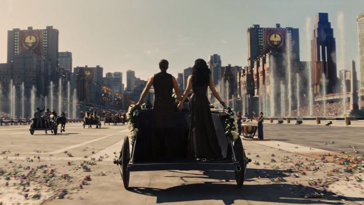 The muted tones create a binary opposition (Strauss) to the grand buildings and the setting, this shows the difference between the artificial beauty of the Capitol and the grim reality of the Games. As the use of a wide shot places Peeta and Katniss in the centre of the screen, leading towards the grand architecture of the Capitol, suggesting that their fate will always lead towards Panem and the corrupt power of the Capitol. Additionally, the use of deep depth of field ensures both the characters and the vast environment are clearly visible. The proxemics of the two characters creates a sense of rebellion alongside mirroring their previous actions from the first Hunger Games. The closeness of the characters creates a sense of solidarity and their body codes (Argyle) gives the impression that the characters are stronger together.