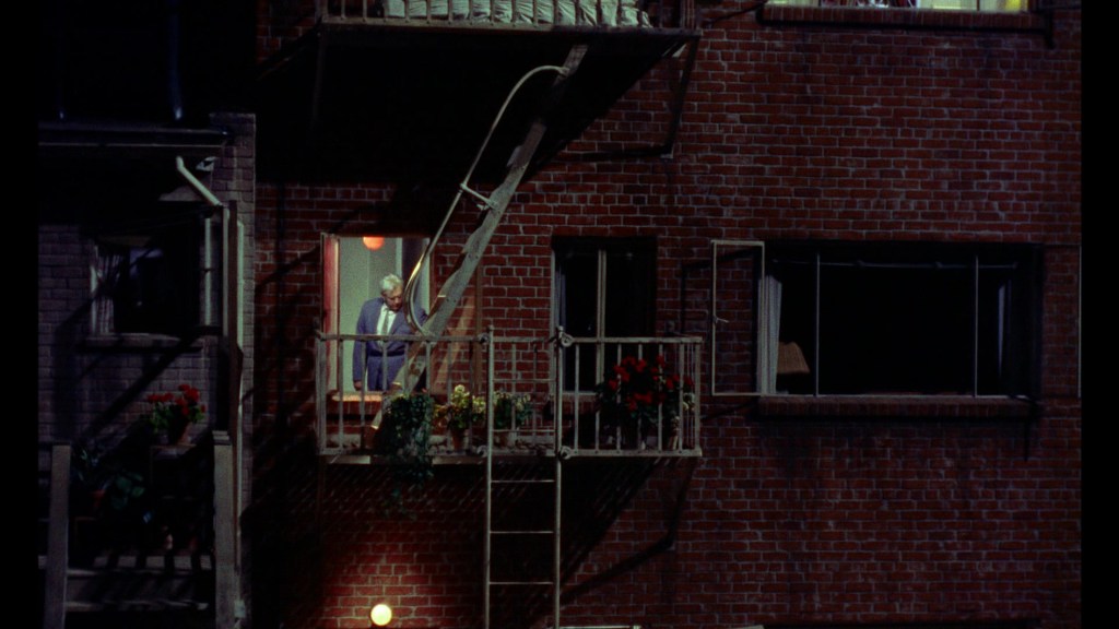 The use of low-key lighting within the shot creates a negative and climatic feeling that contrasts harshly with the first image. Hitchcock’s minimal use of lighting allows the antagonist Lars Thorwald (played by Raymond Burr) to be silhouetted, therefore, immediately drawing the spectator’s attention to the window. Alongside this, the yonic symbolism of the flowers outside the apartment further creates a sense of uneasiness as the spectator is currently unable to see the female protagonist Lisa Fremont (played by Grace Kelly), although she appears unharmed at the end of the film this sequence still promotes fear for the spectator as it is witnessed through the perspective of L.B. Jefferies (played by James Stuart) who has just expressed feelings towards Fremont.
